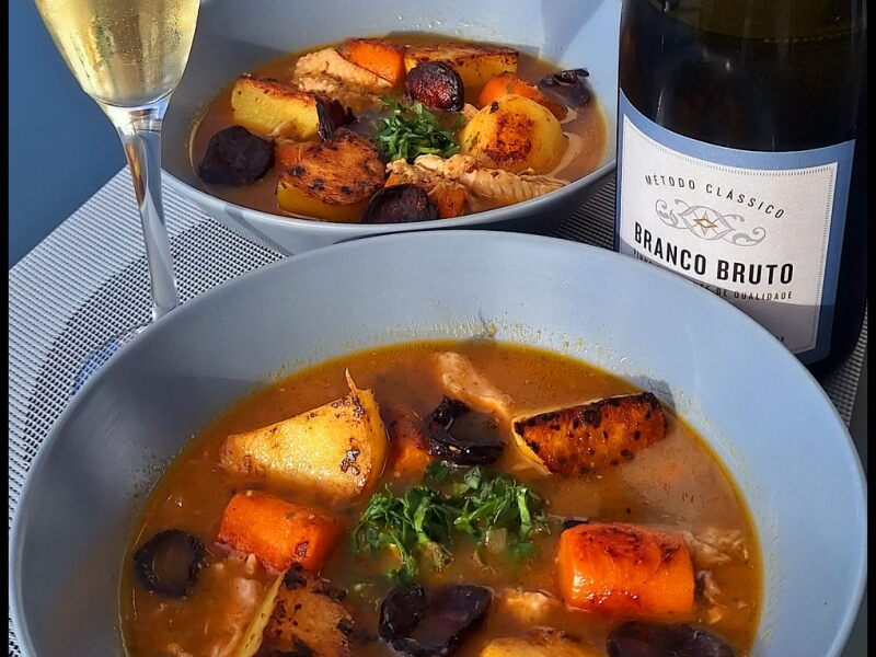 Remove the skin and bone from the chicken and cut the chicken into rough chunks. Chop the salami into small pieces. Add the reserved vegetables, the other half of the mushrooms, cream, chicken and salami and let it simmer for an hour. Add freshly ground pepper and salt to taste.