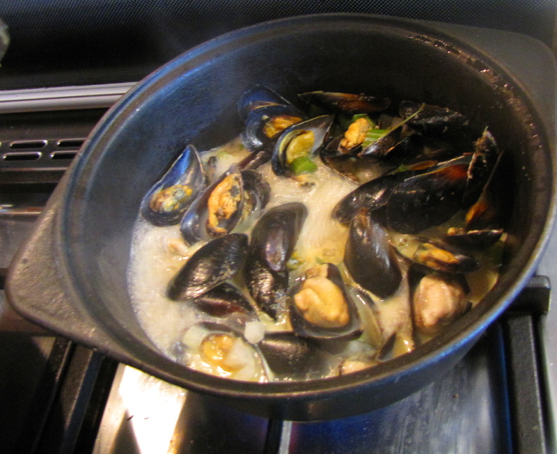 Mussels steaming in a white wine sauce